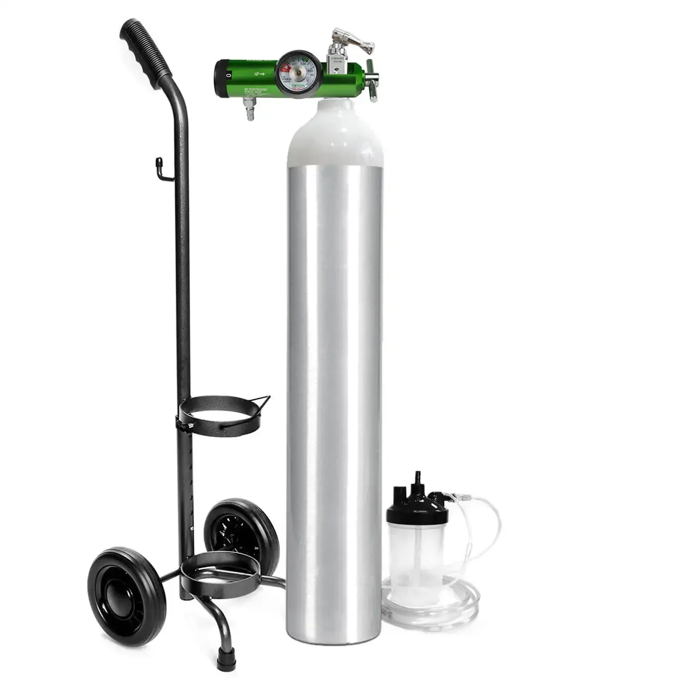 Oxigeno de 680 lts, regulador (standard o con conexión a humidificador), Coche de transporte, cánula (humidificador).